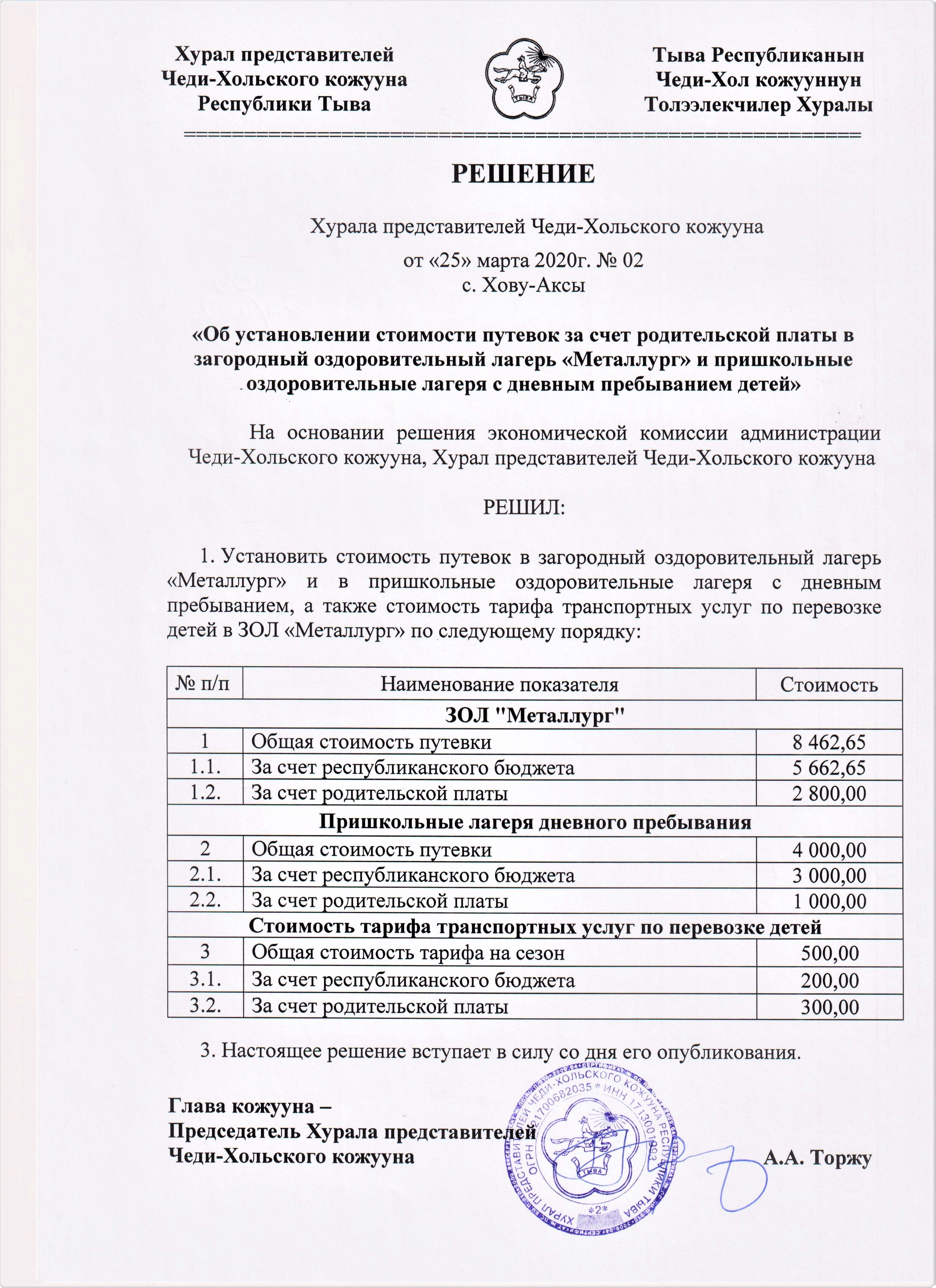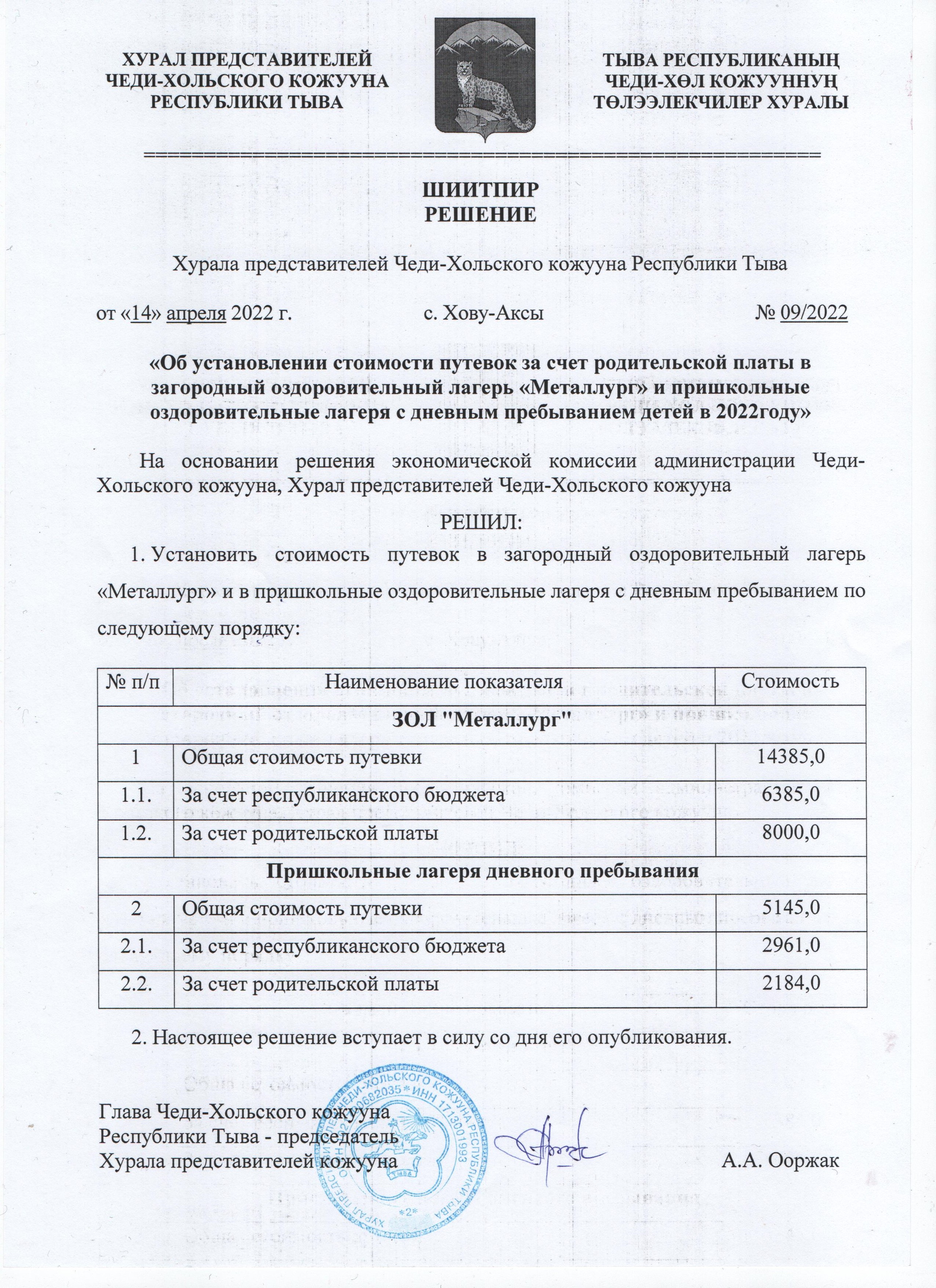 Решения Хурала представителей Чеди-Хольского кожууна Об утверждении размера платы, взимаемой с родителей за содержание ребенка в муниципальных дошкольных образовательных учреждениях Чеди-Хольского кожууна от 14.04.2022 г. №08/2022 Об установлении стоимости путевок за счет родительской платы в ЗОЛ «Металлург» и пришкольные лагеря с дневным пребыванием в 2022 году Об утверждении закупочных цен на сельскохозяйственную продукцию на территории Чеди-Хольского кожууна Об утверждении цены для питания в столовых и буфетах в общеобразовательных организациях Чеди-Хольского кожууна от предпринимателей и частных лиц, работающих в данных учреждениях по договору найма и организации питания в общеобразовательных организациях Об утверждении стоимости путевек за счет родительской платы в ЗОЛ Металлург и оздоровительные пришкольные лагеря с дневным пребыванием Об утверждении размера платы, взимаемой с родителей за содержание ребенка в муниципальных дошкольных образовательных учреждениях Чеди-Хольского кожууна Об установлении стоимости путевок за счет родительской платы в ЗОЛ «Металлург» и пришкольные лагеря с дневным пребыванием в 2021 году Об утверждении закупочных цен на территории Чеди-Хольского кожууна от 11.10.2022 г. Решение-№-5-от-27.02.2024-г.-1